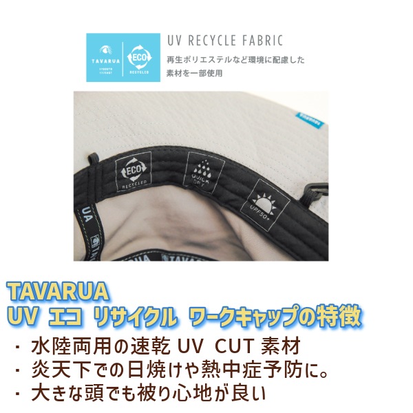 【TAVARUA】タバルアの水陸両用キャップ。 海でのアクティビティをさらに楽しむために欠かせないTAVARUAのサーフキャップが新登場!UVカット機能付きで紫外線からあなたの頭皮を守ります。エコなリサイクル素材を使用しており、地球環境にも優しい一品です。ワークキャップとしても使える汎用性の高さが魅力的。ひも付きなので、ウィンドや波に負ける心配もありません。 SUPやサーフィンなどのマリンスポーツを楽しむ方に特におすすめのアイテムです。TAVARUAのWORKCAP TM2010は、快適さと機能性を兼ね備えた優れもの。シンプルなデザインなので、男女問わず幅広いお客様にお使いいただけます。このサーフキャップで夏の海を存分に満喫しましょう! SIZE / サイズ