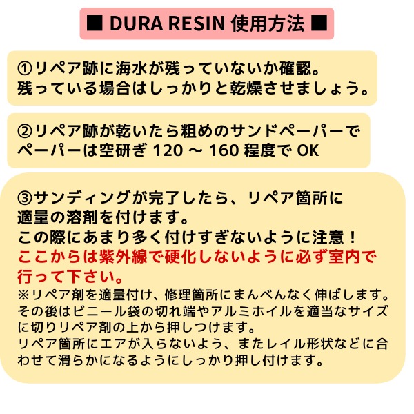 【PHIX DOCTOR】フィックスドクターのサーフボード用修理剤! あなたの愛するサーフボードを守るために、PHIX DOCTOR フィックスドクター 修理剤が登場しました!この0.5ozの小さなボトルには、PHIX DOCTOR の技術が詰まっており、紫外線を使用してサーフィン中の小さな傷や亀裂を簡単に修復し、大切なボードをすぐに使える状態にします。 フィックスドクター デュラレジン (DURA REZN)は、誰でも簡単にサーフボードの修理ができるよう設計されたチューブタイプのサーフボード修理剤です。EPS(エポキシ)・PU(ポリウレタン)素材のどちらでも使えるので、「サーフボードが溶けてしまった・・。」という失敗がありません。