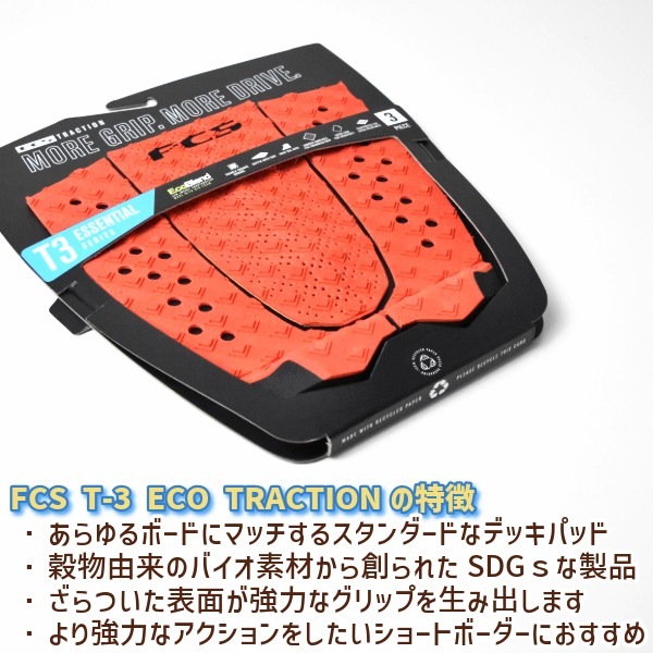 【FCS】エフシーエスのデッキパッド。 FCS T-3トラクションは、快適性、サポート、グリップ力に重点をおいており、後ろ足がトラクションを挟みボードを強く踏み込んで最高のスピードとドライブを実現します。 FCSトラクションシリーズの中でもポピュラーな3ピース構造のT-3がエコ素材で登場。サトウキビをベースにしたバイオレジン素材を使用することで、環境への配慮がなされています。もちろんパフォーマンスはそのまま。 ≪商品詳細≫