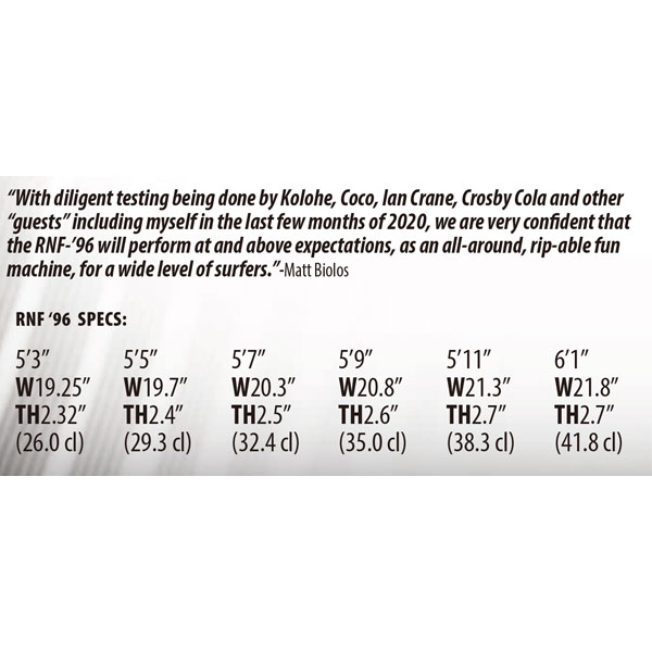 25周年を迎えた「RNF(ラウンドノーズフィッシュ)」を原型そのままでは無く、敬意を払いながらもメイヘムとLOSTライダーたちによって微調整された「RNF'96」。対応する波のサイズも幅広く小波~オバーヘッドまでが最適です。中級者以上のサーファーにおすすめです。