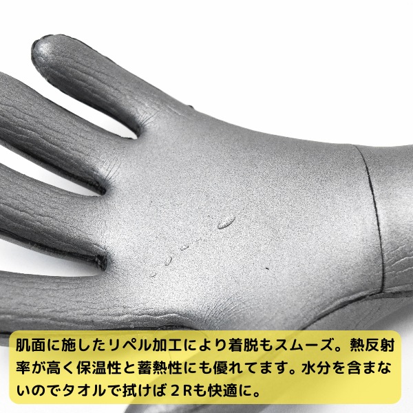 熱反射率が高く保温性と蓄熱性にも優れ水分を吸わないリペル素材に3.5mm厚のストレッチジャージを使用して最高の保温性と耐久性を実現。