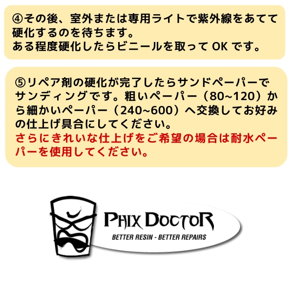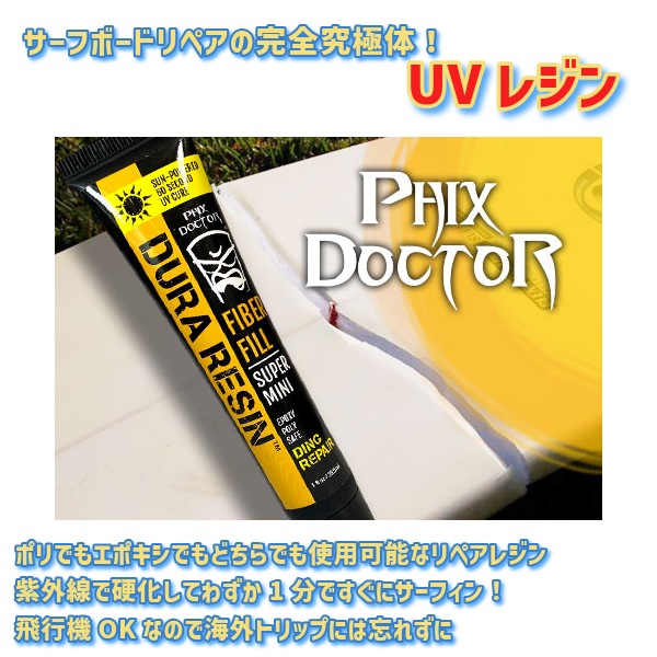 【PHIX DOCTOR】フィックスドクターのサーフボード用修理剤! あなたの愛するサーフボードを守るために、PHIX DOCTOR フィックスドクター 修理剤が登場しました!この0.5ozの小さなボトルには、PHIX DOCTOR の技術が詰まっており、紫外線を使用してサーフィン中の小さな傷や亀裂を簡単に修復し、大切なボードをすぐに使える状態にします。 フィックスドクター デュラレジン (DURA REZN)は、誰でも簡単にサーフボードの修理ができるよう設計されたチューブタイプのサーフボード修理剤です。EPS(エポキシ)・PU(ポリウレタン)素材のどちらでも使えるので、「サーフボードが溶けてしまった・・。」という失敗がありません。